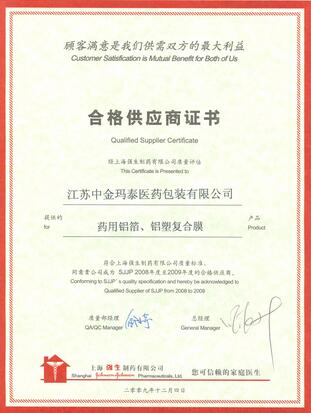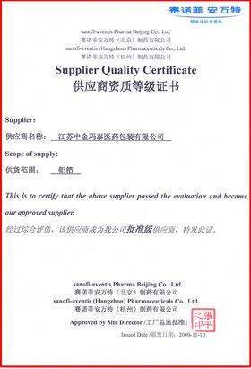 一直以來(lái)中金瑪泰始終秉承對(duì)客戶(hù)負(fù)責(zé)的使命,把為客戶(hù)提供最優(yōu)質(zhì)的產(chǎn)品和服務(wù)作為不懈追求。公司通過(guò)強(qiáng)化質(zhì)量管理,提升服務(wù)水平,為客戶(hù)提供最安全、放心的產(chǎn)品。近日,我公司先后被上海強(qiáng)生制藥有限公司、賽諾菲安萬(wàn)特(北京)制藥有限公司、賽諾菲安萬(wàn)特(杭州)制藥有限公司等多家客戶(hù)評(píng)為2009年度合格供應(yīng)商,并被頒發(fā)合格供應(yīng)商資質(zhì)證書(shū)。