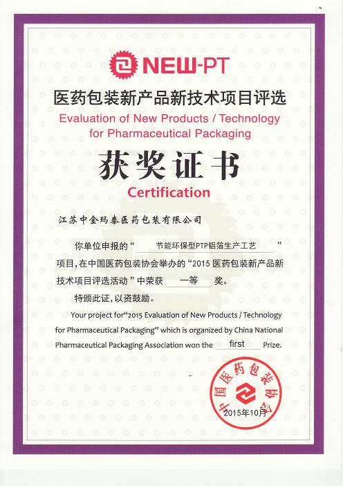 近日,在醫藥包裝新產品新技術獲獎項目發布會上,我公司“節能環保型PTP鋁箔生產工藝”榮獲中國醫藥包裝協會頒發的2015醫藥包裝新產品新技術項目評選一等獎。