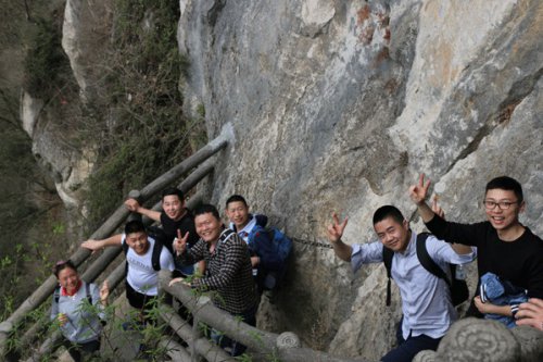 很快我們便來到了本次旅行的第一站,位于大禹故里、北川羌族自治縣的九皇山景區,此時正值中午,春日的陽光溫暖地灑在身上,鼓動著我們向山峰之巔奔去。上山一行,不可謂不艱險,需走棧道,棧道修建在峭壁之上,驚險刺激,但在險峻陡峭之中,也讓大家一覽九皇山的秀美風光。走過棧道,漫步在情人橋上,便可看到集奇、秀、險容為一體的猿王洞,站在山際之間,陣陣山風吹來,仿佛聽見猿王與仙女的愛情傳說在耳邊回蕩,此情此景,有詩贊曰:古藤斜掛牽玉女,飛澗橫鉤渡玄猿